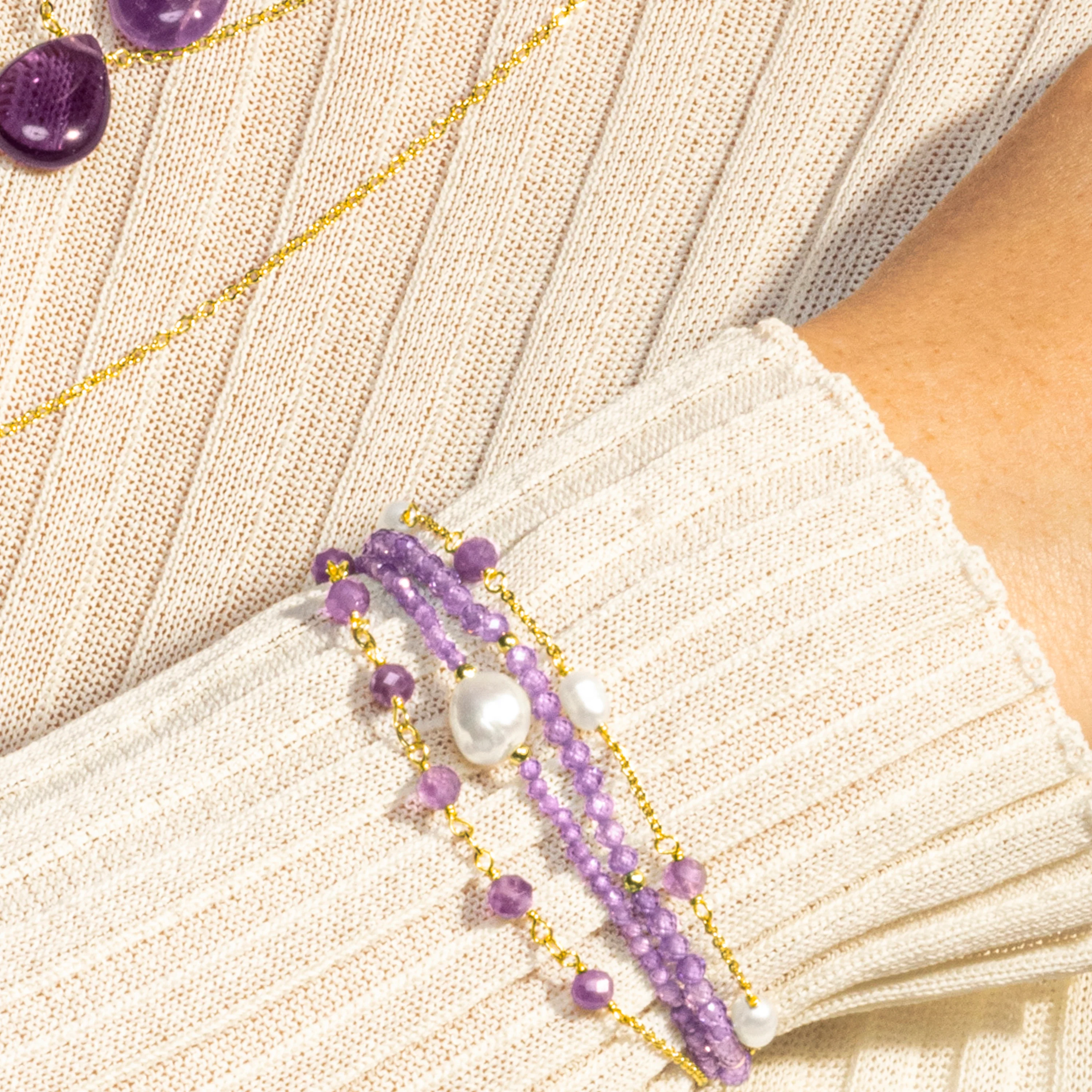 Pulsera Ekhao de Circonita Amatista acabado oro 18k. África Moda te sumerge en un mundo de colores vibrantes, texturas exquisitas y diseños artesanales que reflejarán la esencia de tu espirítu.
